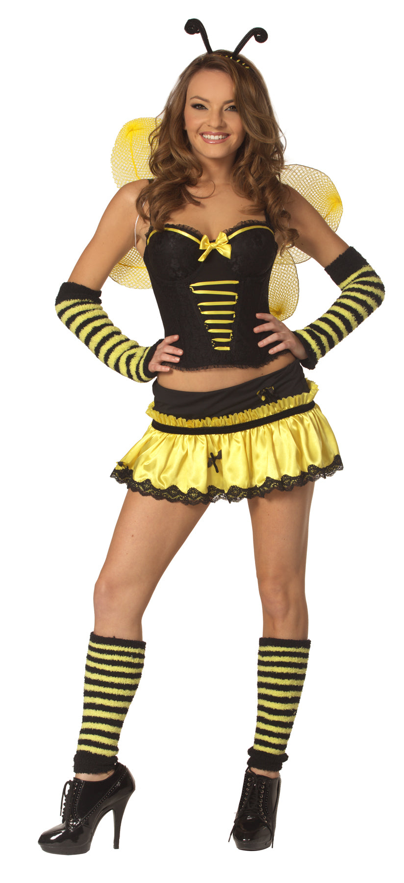 Buzz into the Halloween spirit with our alluring Bees in the Trap Costume. This eye-catching ensemble is designed to transform you into a sexy bee, perfect for making a statement at any costume party. Featuring a sweetheart bustier top, a yellow-trimmed skirt, antennae headband, armbands, and bee wings, this costume has everything you need to create a buzz. (Leg warmers not included.)