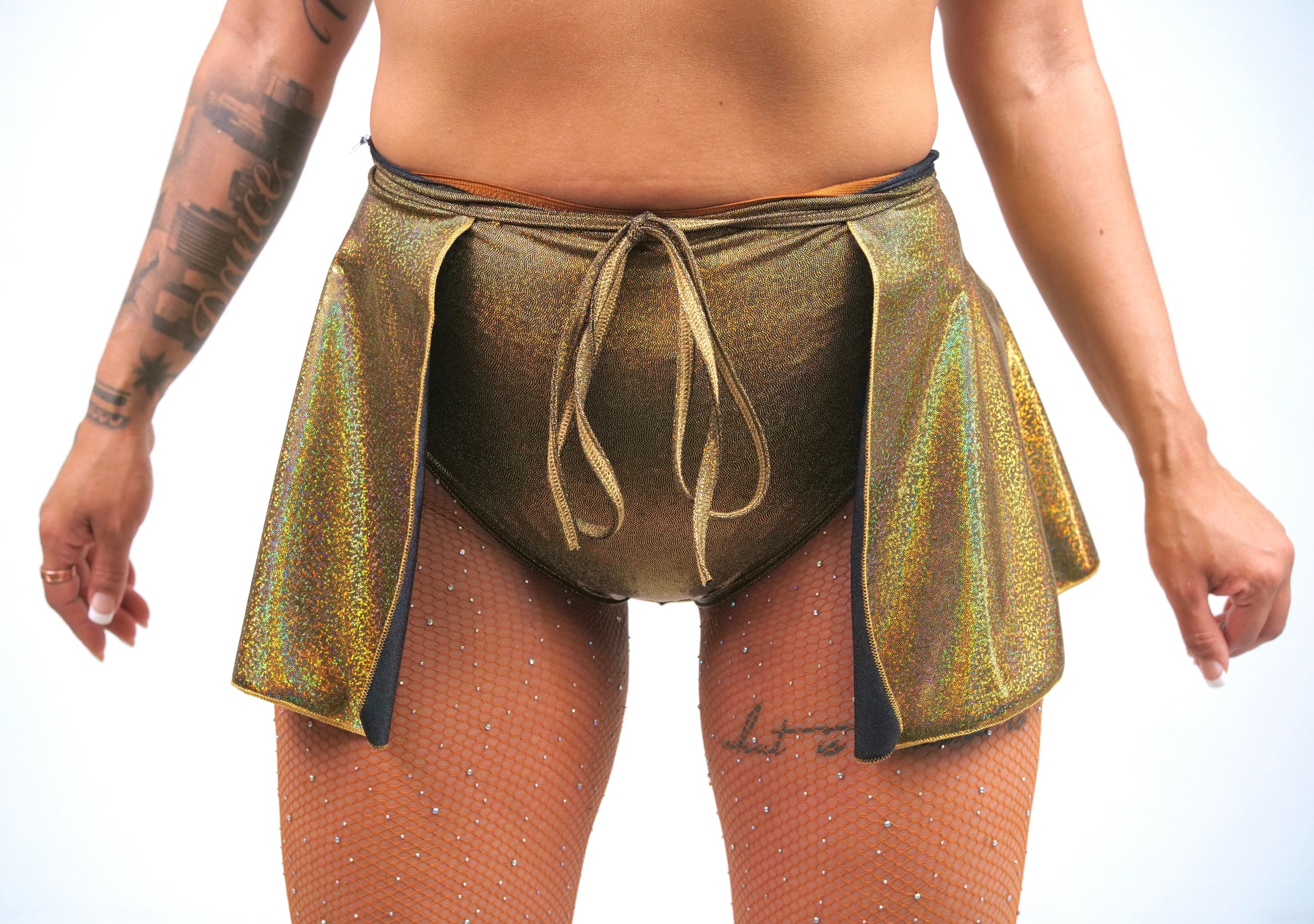 This beautiful holographic wrap around skirt is perfect to wear to your favorite festival, class, or a fun night out. The material is nice and stretchy to accommodate any size and cover up as much as you want. Wear to the side for a peek-a-boo side leg, wear in the middle, or wear it backwards! Use it any way you want!